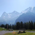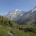 Der Abstieg nach Obersteinberg führt zuerst zurück zu Pkt. 1978 und dann einer stark abfallenden Grashalde entlang. Der Weg ist stellenweise felsig, Vorsicht ist darum angebracht! Auch die Aussicht von der Hotelterrasse lässt keine Wünsche offen: Zahlreiche Wildwasser und Gletscherbäche rauschen in der Tiefe, während an den Berghängen zwischen Jungfrau und Tschingelhorn die Hängegletscher gleissen (nach Pfäffer–Gimmelwald 2h10; nach Trachsellauenen–Stechelberg 1h40).