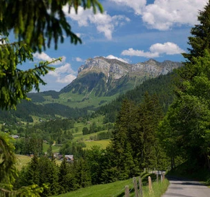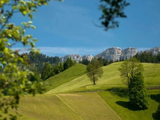 Ebenen Wegs gelangt man weiter zum Berggehöft Oberi Matte und von dort in leichtem Abstieg über Weideland und durch Bergwald am Picknickplatz Stampf vorbei nach Schwanden/Sagi. Auf einem Fahrsträsschen geht es weiter nach Schwanden, danach auf schmalem Pfad in den idyllischen Büelgraben hinunter. Herrlich ist der Blick von der Sonnenterrasse von Sigriswil auf den See und auf die Voralpengipfel und Firnkuppen des mittleren Berner Oberlands.