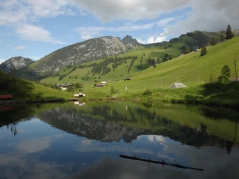 Am Ausgangsort der Wanderung bei der Endhaltestelle Grimmialp Hotel Spillgerten ist der Wegweiserangabe Blauseeli zu folgen. Schon nach einer kurzen Strecke talaufwärts ist das idyllische Seelein erreicht. Es bezaubert mit seinem klaren Wasser, in dem sich die Landschaft und die Berge spiegeln. Die kleinsten Wanderer werden stolz sein, hier mühelos einen See zu Fuss umrunden zu können. Weiter geht es abwärts dem Senggibach entlang in Richtung Schwenden. Kurz vor Schwenden mündet der Fildrich ein, der nun dem Bach den Namen gibt. Ab Schwenden erscheint das Ziel dieser Tour, Zwischenflüh, auf den Wegweisern. Beim Seeboden erreicht man den Wasserspielplatz, wo Kinder verschiedenste Spielmöglichkeiten mit dem Wasser vorfinden. Liebhaber der Berndeutschen Mundart erinnern sich an Ausdrücke wie mit einem «Gutsch Wasser chosle oder chööze». Wer hier zu lange verweilt, kann ab der nahegelegenen Bushaltestelle Tiermatten Wirtschaft die Heimfahrt antreten. Es empfiehlt sich, trockene Kleider zum Wechseln dabei zu haben. Weiter wandern lohnt sich jedoch, es folgt eine wildromantische Partie. Beim Viehschauplatz Anger wartet die nächste Attraktion, eine überdachte Feuerstelle. Nach wenigen Metern auf der Kantonsstrasse führt die Route wieder dem Fildrich entlang. Bei der Wasserbrücke ist der Fildrich zu queren und auf der Kantonsstrasse talaufwärts zu halten. Bald ist das Ziel bei der Bushaltestelle Zwischenflüh, Post erreicht.