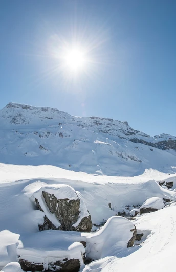 Von Adelbodens Dorfzentrum erreicht man Unter dem Birg per Bus oder zu Fuss über Boden, entlang der Engstlige. Von dort gelangen die Winterwanderer bequem per Luftseilbahn auf die 2000 m ü.M. gelegene Engstligenalp. Der gut unterhaltene, mehrheitlich flache Winterwanderweg führt vorbei an tief verschneiten Sennhütten zu herrlichen Aussichtspunkten. Nur der Schnee knirscht unter den Schuhen, ansonsten herrscht absolute Stille. Nach der sportlichen Betätigung geht`s zum Punsch oder zu einem feinen Huskaffee in eines der beiden Berggasthäuser der Engstligenalp.