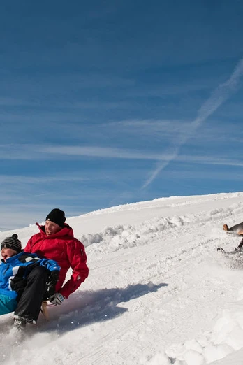 Winterwandern: Die einfache Wanderung und Schlittenfahrt zum Chrinetritt dauert rund 40 Minuten und führt über einen wunderschönen Panoramaweg. Dort startet der rasante Teil der Abfahrt.