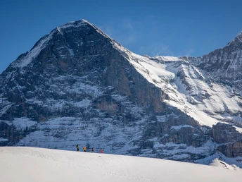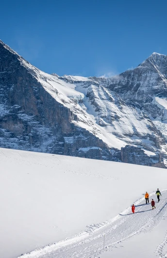 An der Bergstation beginnt die Wanderung. Gleich am Anfang lohnt sich ein kurzer Abstecher zum Gipfel des Männlichen. Der sogenannte Royal Walk ist besonders für Kinder faszinierend. Er führt von der Bergstation der Männlichenbahn auf den Gipfel und lädt zum Entdecken von allerlei Königlichem ein. Aber nun zur Winterwanderung auf die Kleine Scheidegg: Die Strecke führt sanft bergab über breite, präparierte Wege. Auf knapp sechs Kilometern wandert man in zwei bis zweieinhalb Stunden zur Kleinen Scheidegg. Der Höhenunterschied bleibt moderat: rund 310 Meter im Aufstieg und 480 Meter im Abstieg. Besonders eindrucksvoll ist der Blick auf die Eigernordwand, die sich im Laufe des Weges immer wieder in voller Wucht zeigt. Auch der Blick Richtung Grindelwald ist eindrücklich. Kurz vor dem Ziel, der Kleinen Scheidegg, erwartet die Wandernden ein rund 30-minütiger Schlussanstieg. Wer unterwegs oder am Ende der Tour einkehren möchte, hat mehrere Möglichkeiten.