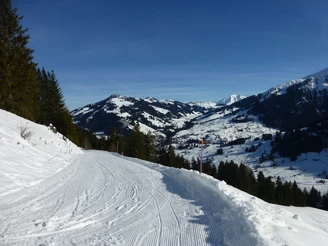 Der Winterwanderweg startet gleich beim Ausgang der Bergbahn. Nach einem kurzen Abstieg zum Skilift, steigt der Weg über einen sanften Gratrücken hoch zum Vorderen Eggli. Der Aufstieg ist angenehm und man hat Zeit die immer besser werdende Aussicht zu geniessen oder die schönen Schwünge der Skifahrer zu bestaunen. Kurz nach der Bergstation des Skilifts hat man den höchsten Punkt erreicht. Die Sicht auf die Gummflue und in das umliegende Saanenland sind atemberaubend.
