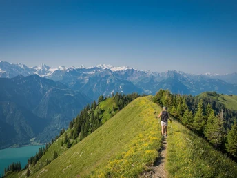Die Aussicht auf dem Augstmatthorn ist grossartig: Tief unten liegt der Brienzersee. Dahinter türmt sich die Schynige- Platte-Faulhorn-Kette auf, und darüber leuchten die Gipfel der Alpen. Nach Norden geht der Blick zum Hohgant und ins Einzugsgebiet der Emme, während im Westen Güggisgrat und Solflue den Talkessel von Habkern begrenzen.