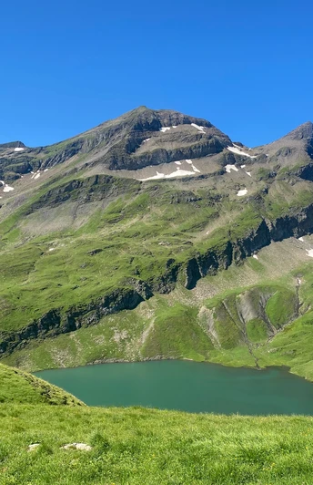 Grindelwald, le charmant village au cœur des Alpes bernoises, offre diverses possibilités de randonnée avec une vue spectaculaire. Cette belle randonnée offre la possibilité de marcher sur des sentiers solitaires. Ceux qui cherchent une randonnée physiquement exigeante peuvent partir directement du village de Grindelwald et monter à First. Nous choisissons la version plus confortable avec le téléphérique. Une fois arrivés en haut, nous nous joignons aux nombreux autres marcheurs et partons en direction du Bachsee. Cette première étape est magnifique et parfaite pour s'échauffer. Après quelques kilomètres – environ dix minutes avant d'atteindre le Bachsee – un panneau indique un sentier menant au Hagelseeli ; nous le suivons. Le chemin serpente à travers des prairies et nous passons déjà devant un premier petit lac sans nom. Peu après la bifurcation, la vue sur le Bachsee d'en haut s'ouvre, en plus de la vue sur le Faulhorn et les sommets emblématiques de Grindelwald.