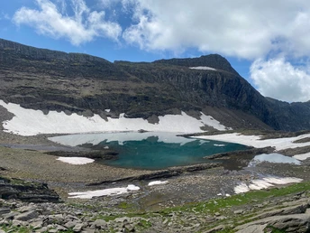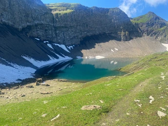 Nous continuons et suivons bien le chemin balisé en direction du Hagelseeli. Ce lac de montagne pittoresque se trouve à environ une heure. Une première pause s'impose ici. Le chemin est peu exigeant. Pourtant, même si nous faisons la randonnée en plein été, il y a parfois de la neige. Un équipement et une expérience appropriés sont donc nécessaires. En continuant sur certains de ces champs de neige, nous arrivons au Häxeseeli. Il est situé sous la Chlyne Chrinne à 2465 m d'altitude. Le décor a un aspect magique et sombre. En effet, nous marchons le long de rochers massifs et sombres dont l'ombre tombe également sur le Häxeseeli. Le reflet dans l'eau et le scintillement sont très particuliers.