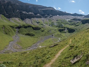 À la station de montagne Oldenegg, on peut descendre directement en téléphérique jusqu’à Reusch. Ceux qui souhaitent encore parcourir la spectaculaire cuvette glaciaire Olde suivent la signalisation « Olden – Grand parcours circulaire ». Après une courte montée, le sentier de randonnée fait une boucle à droite, puis contourne la cuvette en grand arc à gauche, sans différences d'altitude notables, au-dessus du fond de la vallée. Aux chalets d'alpage de Untere Oldenalp, on traverse le Oldebach. En restant à gauche, on boucle le circuit en 25 minutes à la station de montagne d'Oldenegg. En bifurquant à droite en direction de Reusch, on évite le trajet en téléphérique et on descend encore 500 mètres de dénivelé dans le cirque du Büdemli jusqu’à la station de vallée de Reusch. Le beau tronçon près de la cascade après P.1792 est assez raide et demande un peu de concentration.