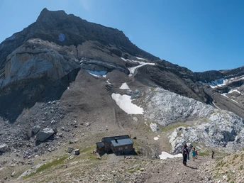 Depuis la station intermédiaire Tête aux Chamois, on atteint en à peine cinq minutes la Cabane des Diablerets. De là commence la descente vers Oldenegg dans la cuvette Martisberg. Ce qui est une piste de ski en hiver (ce qui se reconnaît aisément aux pylônes de remontée mécanique), est en été orné de nombreuses fleurs alpines telles que l'aconit napel, la gentiane pourpre ou les splendides chardons argentés. Marquant, au bas de Martisberg, le Schluchhore domine la vallée opposée. Peu avant Oldenegg, le chemin passe par une galerie – la section avant la galerie doit être franchie rapidement en raison du risque de chutes de pierres.