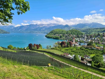 Hintergrund: Kaum zu glauben, aber bereits seit über 1000 Jahren werden am Thunersee Reben angebaut. Dank dem als Wärmespeicher wirkenden Thunersee und den häufigen Föhnwinden gedeihen hier auf 600 m ü. M. Riesling-Sylvaner und Blauburgunder. Inmitten der Spiezer Rebberge liegt das Schloss Spiez, das zu den Kulturgütern von nationaler Bedeutung zählt.