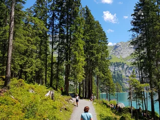 Voll wilder Schönheit ist der Aufstieg vom See durch die Felsbalmen zum Underbärgli und, wesentlich steiler ansteigend, zwischen Felsbändern hindurch zu den Alpweiden des Oberbärgli. Über die langgezogene Seitenmoräne des Blüemlisalpgletschers steigt man in die Schutthalden am Südhang des Schwarzhorns. Mit jedem Schritt wird die Sicht in die Schründe und Gletscher der Bergriesen umfassender. Unvermittelt steht man auf der Passhöhe des Hohtürli. Die Blüemlisalphütte SAC befindet sich noch rund 60 m weiter oben. In unmittelbarer Nähe erheben sich die weissen Gipfel der Blüemlisalp, in der Hauptkette Morgenhorn, Wyssi Frau und Blüemlisalphorn (höchster Gipfel des Massivs, 3657 m). Auch die mächtige Firnmulde des Blüemlisalpgletschers beeindruckt trotz Gletscherschwund immer noch. Der sehr steile Abstieg auf die Kientaler Seite erfolgt auf vorzüglich angelegtem Bergweg; dennoch ist Vorsicht geboten! Einem langgezogenen Felsband entlang windet sich der Weg in die Tiefe zur Obere Bundalp. Über Underi Bundalp führt ein breiter Alpweg, den Bundbach zweimal querend, zum Bundstäg hinab, schwenkt vor diesem hangaufwärts und erreicht über die Weide Dündenessli Hotel und Bus-Endstation Griesalp.