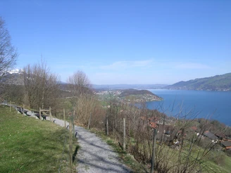 Die Route ist einfach zu finden, ist sie doch ab dem Ausgangsort Bushaltestelle Aeschiried Schulhaus als Panoramaweg ausgeschildert. Das Ziel Därligen findet sich auf allen Wegweisern. Ohne grosse Höhendifferenzen gelangt man zum Hellbode. Ein erstes Mal wird der Ausblick auf den Thunersee, den Niesen und das Niederhorn frei. Nun schliesst sich ein Aufstieg bis Ufem Viertel an. Ein Rastplatz mit gedeckter Feuerstelle verlockt zum Verweilen. Weiter geht es auf einer Fahrstrasse abwärts durch Wald, vorbei an einer weiteren Raststätte. Abschnitte über Pfade oder durch Weiden sorgen für Abwechslung. Bei Chüngstuel gelangt man zur dritten Raststelle. Sie bietet einen herrlichen Ausblick auf den Thunersee. Ob sich die Ortsbezeichnung Chüngstuel – Königsstuhl – auf die majestätische Lage bezieht? Ebenen Weges ist kurzum die Hängebrücke über den Spissibach erreicht. Sie bildet Teil des Brückenweges rund um den Thunersee. Sechs Brücken sollen bestehende Wege verbinden und anstrengende Auf- und Abstiege zur Überwindung von Schluchten vermeiden. Vier weitere Brücken sind geplant, diejenige über die Gumischlucht bei Sigriswil ist erstellt und erfreut sich ebenfalls grosser Beliebtheit. Ohne wesentliche Höhenunterschiede wandert man nun auf einer Fahrstrasse weiter zur Meielisalp. Wenig später ist rechts abzubiegen. Nun erfolgt der Abstieg nach Därligen. Die Wechsel zwischen Partien im Wald, Pfad über Weiden, Fahrweg und Strasse sorgen für Kurzweil. Beim Egghubel kurz vor Därligen bietet sich nochmals ein Rastplatz mit Feuerstelle zum Ausruhen an. Auf einer Strasse gelangt man absteigend ins Dorf Därligen und steuert entlang der Bahnlinie auf das Ziel der Wanderung, den Bahnhof, zu.