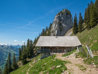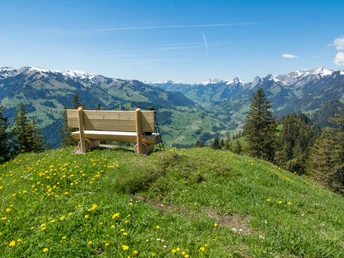 Depuis la gare de Weissenburg, nous suivons d'abord la signalisation vers Weissenburgberg et au croisement de chemins à l'altitude 836 m, nous prenons à droite. Après avoir quitté la forêt, nous nous dirigeons légèrement à gauche sur un sentier à peine visible vers un arbre remarquable dans l'alpage. En passant devant le café de Lisa, nous suivons à Weissenburgberg la signalisation en direction de Flüeberg. On traverse brièvement une prairie alpine, puis une route d'alpage jusqu'au croisement de chemins à 1128 m près des chalets Stigimaad. Nous tournons à gauche et montons la raide route d'alpage jusqu'à Flüeberg, où nous atteignons à 1348 m une large crête qui offre pour la première fois une belle vue sur le Simmental. Suivant la crête herbeuse, nous prenons la signalisation en direction d'Oberi Loohere jusqu'à l'alpage Unders Chäli, où nous suivons une crête peu marquée. La crête se perd bientôt dans la forêt, il faut parfois chercher les marques de chemin. Après la forêt, un éboulis est traversé, puis peu après on atteint le col anonyme près de la tour rocheuse du Looherehürli.