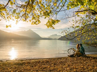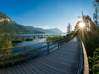 La deuxième étape du parcours panoramique te mène de Sigriswil à Merligen au bord du lac. Profite d'une courte pause au lac avant que le sentier de randonnée ne monte à nouveau légèrement et ne longe la partie supérieure du lac de Thoune. De là jusqu'à Interlaken, les randonneurs du parcours panoramique du lac de Thoune croisent les pèlerins en route vers Saint-Jacques-de-Compostelle. Au pied du Niederhorn, le chemin passe près des grottes de Saint-Béat. En plus du chemin du bord du lac à travers la réserve naturelle, Unterseen et Interlaken invitent à la détente.