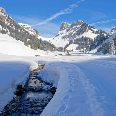 La vallée du Justistal, dont l’entrée est caractérisée par l’imposant Niederhorn, est considérée comme un paradis hivernal à l’enneigement sûr. Elle doit son nom au moine Justus, qui répandit autrefois la bonne parole au bord du lac de Thoune avec son compagnon Beatus.Le chemin de randonnée hivernale préparé part de Grön, suit la piste de ski de fond en montant légèrement le long du Grönbach qui se jette dans le lac de Thoune à Merligen. De l’eau étincelante sous forme de glace: une nouvelle merveille chaque hiver qui accompagne tout randonneur. Vous passez plus loin devant le Spycherberg où se déroule chaque automne la légendaire fête «Chästeilet», durant laquelle le fromage produit est réparti entre les différents fermiers proportionnellement à la quantité de lait fournie.De là s’offre à vous le fond de la vallée du Justital, impressionnante, voire quelque peu mystique avec une vue sur votre objectif, la cabane d’alpage Hindersberg et, tout au fond, le col du Sichel (col de la faucille) qui mène à l’ouest des Sieben Hengste jusqu’à Eriz dans le Zulgtal. Le retour au point de départ se fait par le même chemin de randonnée hivernale, facile et à l’écart du monde.