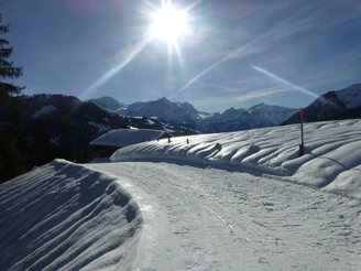 Die Talfahrt beginnt einige Meter hinter dem Bergrestaurant. Die genüssliche Fahrt führt durch Wälder und die stille Gstaader Bergwelt. In Grund endet die Schlittelbahn. Von dort aus geht es zu Fuss via Winterwanderweg zurück zur Talstation Eggli.