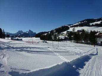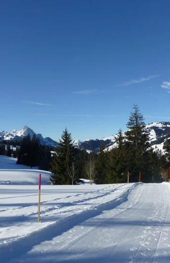 La section suivante à travers le parcours de golf est la plus belle de la randonnée. Presque à niveau, on traverse le parcours de golf profondément enneigé et désert. Les vues sur les montagnes de la vallée inférieure et supérieure de Simmental avec le Spielgerten et en direction de Château-d'Oex avec le sommet marqué du Rubli sont uniques. À la fin du parcours de golf, le sentier hivernal fait demi-tour et monte de nouveau plus fortement. Bientôt apparaît le restaurant de montagne Kübeli. Une pause sur sa terrasse ensoleillée est vivement recommandée !