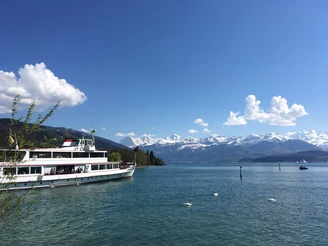 Au panneau indicateur de la gare de Thun, la destination de la balade, Gwatt, est déjà indiquée. Le chemin suit d’abord le quai en direction du lac de Thoune. Après une courte distance, on traverse un ponton en bois pour atteindre l’emplacement de l’ancienne gare de Scherzligen. De 1861 (ouverture de la ligne ferroviaire vers Spiez) à 1893, Scherzligen était la gare terminus de la ligne en provenance de Berne. Les voyageurs et marchandises continuaient alors leur trajet par bateau à vapeur. Des panneaux expliquent les « histoires de transport de Scherzligen ». Un peu plus loin apparaît l’église de Scherzligen, construite entre le 10e et le 12e siècle. Elle est appréciée pour les cérémonies de mariage. Pour les pèlerins sur le chemin de Compostelle Einsiedeln-Genève, elle constitue une étape importante. Juste après, on atteint le parc Schadau avec le château du même nom (construit en 1846). Le parc abrite le panorama Wocher, une peinture circulaire de Thoune datant de 1814. Du côté du lac, la vue s’étend sur le trio légendaire Eiger, Mönch et Jungfrau. À la sortie du parc Schadau, il faut marcher quelques mètres le long de la route du lac, puis tourner à gauche pour emprunter le nouveau chemin de rive. Peu après, ce dernier débouche sur la route de Rougemont. Ensuite, on suit de nouveau la route du lac sur une courte distance. Puis, on passe devant le chantier naval, la plage (appelée Strämu par les habitants de Thoune), le stade Lachen, et l’on rejoint le chemin de Pfaffenbühl. Le chemin de plage continue le long de la rive et emprunte une passerelle sur le lac jusqu’au parc Bonstetten. Ce parc-jardin du 18e siècle de la résidence de campagne est une zone de détente populaire pour petits et grands. En longeant la réserve naturelle de Gwattlischemoos, on arrive à la destination de la balade, l’arrêt de bus Gwatt, Moos.