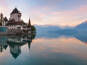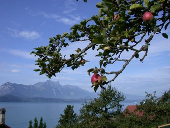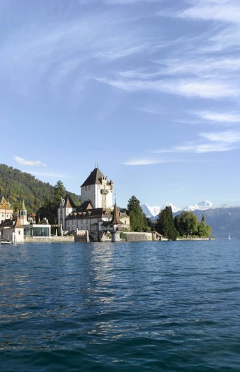 Quiconque tente de classer le imposant château d’Oberhofen en raison de son architecture fantaisiste se trouve en grande difficulté : il s’agit en réalité d’une ancienne fortification médiévale, qui a toutefois été adaptée au 19e siècle aux conceptions romantiques idéalisées du Moyen Âge. Aujourd’hui, le château-musée, ouvert en 1954, fait partie des filiales du Musée historique bernois et présente une vaste exposition sur la culture de l’habitat dans le canton de Berne. À proximité, dans le domaine Wichterheer, se trouvent un musée des horloges et instruments de musique mécaniques ainsi que la collection d’art Im Obersteg. Depuis la station de bateau à côté du château, le sentier de randonnée monte d’abord à travers le village, puis se dirige vers l’est en direction de Klösterli. Après avoir traversé le Riderbach, on rencontre le vignoble d’Oberhofen exposé au soleil. Dans sa partie supérieure, le chemin continue vers Längenschachen. De là, un sentier longe la lisière de la forêt d’Örtli, proche du lac. Dans le quartier Örtli du village de Gunten, un prochain ravin se jette, que l’on traverse en montant légèrement, avant de descendre finalement vers Gunten. De Gunten, on monte d’abord sur une petite route goudronnée en direction de l’hôtel Bellevue, puis on continue sur un chemin non revêtu, passant devant des fermes et des vergers ainsi que par la forêt. Par moments s’ouvrent des vues idylliques sur le lac et le Niesen. Après la descente vers Stampach, en passant devant des vignes, une petite route qui se rétrécit en sentier mène à une prairie de montagne riche en fleurs et offrant une belle vue au-dessus du petit château de Ralligen. À travers la forêt de Rallig et en passant devant l’église, on arrive en bas à la station de bus et de bateaux de Merligen.