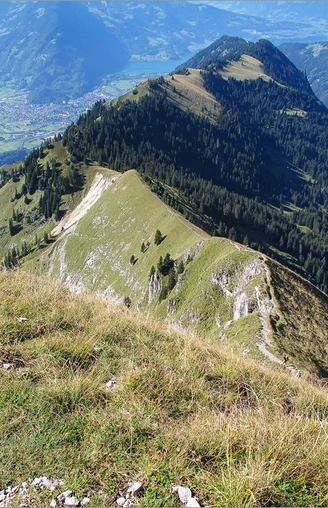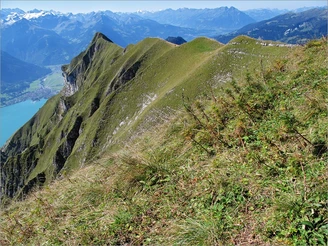 Auf dem markierten Weg folgt ein heikler und ausgesetzter, aber mit Ketten gut gesicherter Aufstieg zum Augstmatthorn 2'137m (T4). Auf der anderen Seite führt der Weg zuerst leicht abwärts zum «Suggiturm» (2'085m), danach steiler bis zur Abzweigung Richtung Niederried.