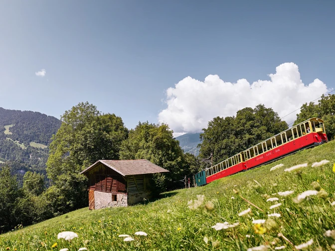 La piste commence à la gare de Wilderswil et monte jusqu'à la gare intermédiaire de la Schynige Platte. Depuis Wilderswil, la piste raide vous conduit principalement à travers une forêt de montagne ombragée jusqu'à Breitlauenen. Ce qui rend cette montée particulièrement plaisante, ce sont les vues qui englobent les forêts de feuillus de la vallée et la flore et la faune alpines colorées à des altitudes variées. Vue digne d'un tableau: La piste menant à Breitlauenen est récompensée par un panorama visible une fois arrivé. La gare intermédiaire de Breitlauenen est située sur la pente nord de la longue chaîne du Faulhorn. Elle est perchée, comme une terrasse, au-dessus du fond de la vallée et d'Interlaken. À gauche et à droite, les bras semblables à un fjord des lacs de Brienz et de Thoune s'étirent et, derrière eux, les grands pics préalpins de Brienzer Rothorn, Augstmatthorn et Niederhorn montent vers le ciel. C'est ici que le peintre Ferdinand Hodler réalisa certaines de ses plus célèbres uvres, comme «Der Brienzersee von Breitlauenen aus» (Une vue du Lac de Brienz depuis Breitlauenen).