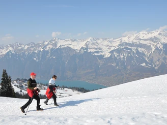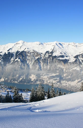 Le télésiège Axalp - Windegg vous emmène confortablement à travers le paysage hivernal jusqu’au point de départ de la randonnée. Une fois arrivé à la station supérieure de Windegg, le restaurant Spycher vous invite à un petit rafraîchissement avant de retourner à l’Axalp par le sentier de randonnée d’hiver vers Chrutmettli / Restaurant Hilten. Le sentier est bien préparé et descend à travers des étendues enneigées et des forêts jusqu’à Chrutmettli, où se trouve le restaurant Hilten. Là, vous profiterez d’un magnifique panorama avec le lac de Brienz bleu émeraude et les montagnes environnantes. Depuis le restaurant Hilten, le chemin mène à travers les forêts enneigées pour retourner à l’Axalp.