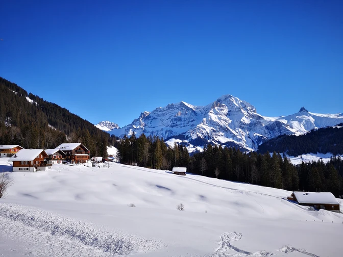 Von der Bus-Endstation Adelboden auf der belebten Dorfstrasse das Dorf westwärts durchqueren. Bei Heinrichseggen zweigt ein Pfad von der Strasse rechts ab. Auf diesem wird rasch an Höhe gewonnen. Nach 300 m mündet der Pfad in eine Waldstrasse, auf der es in mehreren Kehren weiter aufwärts zur Verzweigung Uelisgrabe geht. Hier hält man links und gelangt nach einem letzten kurzen Aufstieg zum schönsten Teilstück der Route, das auf einer längeren Strecke über Flueweid praktisch eben dem Hang entlang führt. Unterwegs bietet sich eine bezaubernde Sicht auf das winterliche Allebach-Tal und auf das belebte Skigebiet Sillerenbühl an der gegenüberliegenden Talseite. Nach einem kurzen Abstieg durch den Wald erreicht man die Brücke über den Stigelbach. Das Restaurant Schermtanne liegt einige Schritte weiter westlich. Von dort aus bringt der Skibus auch Wanderer zurück nach Adelboden. Der Rückweg ins Dorf kann aber auch ohne weiteres zu Fuss bewältigt werden.