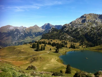 Am Ausgangsort Meiebergalp Pt. 1851 folgt man der Wegweiserangabe Seebergsee. Über Weiden wird zuerst ohne grosse Höhenunterschiede, dann ansteigend der Sattel Pt. 1921 erreicht. Links ist das Niderhore zu erblicken, ein weniger bekannter Namensvetter des mit Gondelbahn erreichbaren beliebten Ausflugzieles am Thunersee. Überraschend zeigt sich jetzt der Seebergsee, dem man sich nun absteigend nähert. Beim Wegweiser am See ist rechts Richtung Stierenberg (Stierenseeberg) abzubiegen. Ein letzter Blick auf den Seebergsee lohnt sich. Auf einem Fahrweg geht es zwischen den Bergen Muntiggalm rechts und Seehore links an der Alp Stierenberg vorbei, dann durch eine Weide ansteigend in den Sattel Gubi. Hier öffnet sich der Ausblick westwärts auf die Waadtländer und Freiburger Alpen. Nach einem Abstieg wird rechts haltend weiterhin durch Weiden Hinder Chumi erreicht. Ab hier ist der Wegweiserangabe Meiebergalp zu folgen. Über Weiden, abwechselnd ebenwegs, auf- und abwärts über Ober Muntigli, kehrt man zur Meiebergalp zurück. So sind der Seebergsee wie auch die Berge Muntig- und Chumigalm umrundet.