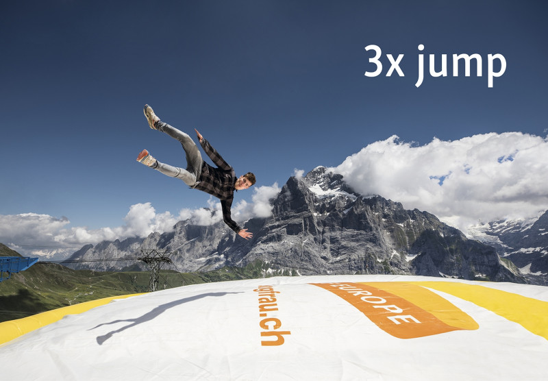 Tief Luft holen, loslassen, ins Leere springen und - landen wie auf einer Wolke. Für diesen Spass braucht man weder Helikopter noch Fallschirm und auch keine überdurchschnittliche Fitness. Ein Besuch auf Grindelwald-First genügt. Auf dem Aussichtspunkt erwartet die Wolke, genannt Bagjump, Sprungfreudige jeden Alters und jeder Statur. Das 15 mal 15 Meter grosse und 3,5 Meter dicke Luftkissen direkt neben der Bergstation federt Landungen aus unterschiedlichen Höhen stets sanft ab. Das Gefühl dabei? Wolke sieben.